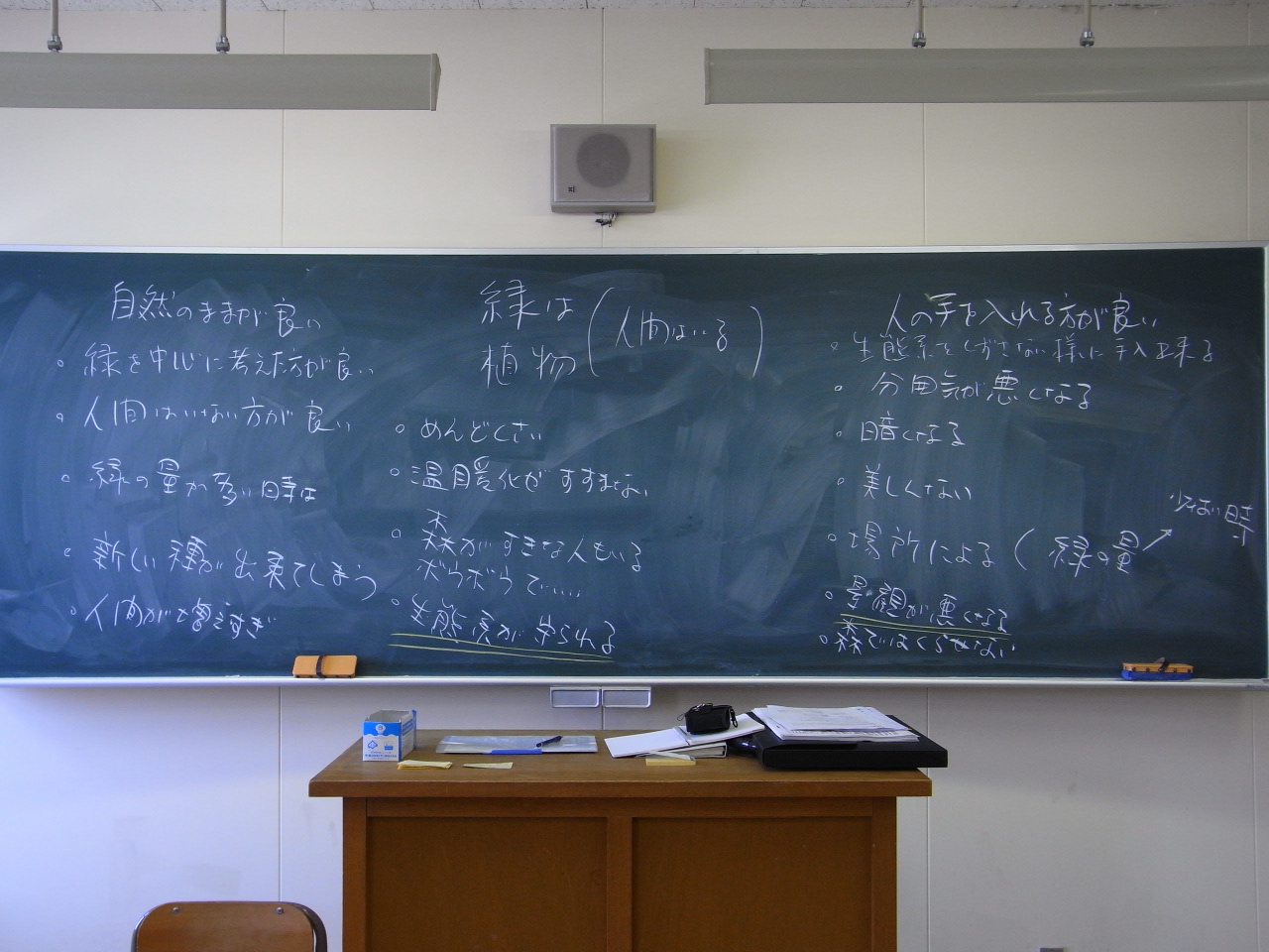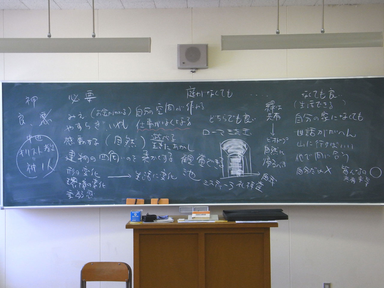 季節感 アガパンサス 百合(ゆり)科 開花時期は、 6/20頃~ 7/ 末頃。南アフリカ原産。明治時代中期に渡来。 根は太く強いので、斜面や土手などの土の流出を防ぐのに役立つらしい。 だそうです 勉強になります ありがとう う~ん 多分「光沢感」という言葉にだけに印象が集中しちゃったかな スポーツの楽しさは伝わります 庭や公園とかもっと広く見てみましょう 緑の道 歩道に広がる芝生 多分、生き生きと見えたのでしょう アプローチ、芝生、近景、遠景と広がる空間に注目しました どこか場所の説明がほしい・・・ ノンタイ 不思議な構成の水際ですね モルタル、アスファルト、水生植物と すごい素材はありませんが、建物のごく近くまで水路を取り入れているのが面白いですね もう一度なぜ撮ろうとしたかを思い出せば簡単なコメントがでると思います そうしたら、もっと見る人も写真が理解できると思いますよ ありがとう またまた、黒板です ディベードをしようと思ったのは、学生さんがとても明るく授業中も活発に質問ができたからです ディベードの内容は、皆から募ります 第二週で終わりの予定です 今週のテーマは庭は必要かです 緑を学ぶ学生さんですから「必要」が多数派ですが「必要でない」意見も出ます 自分だけのために庭を造るのはエゴイズム 共有できる庭をもっと造るべき まだまだ意見を戦わせるまではいきませんが、皆きちんと主張できるのはすばらしい 結論を出す必要はないので議論の総括は「克己」 (善い神、悪い神のいた)古代ギリシャを理想としてキリスト教(の一神教)支配から人間中心の時代を切り開いたルネッサンスの話を例に、考える大人になってほしいと思っています