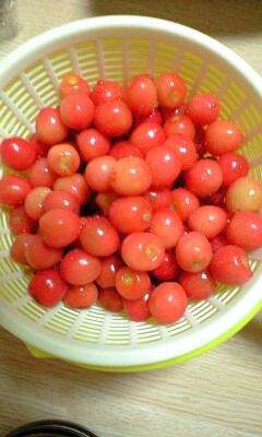 私の庭で採れたさくらんぼです。小さいザルいっぱいに採れました。